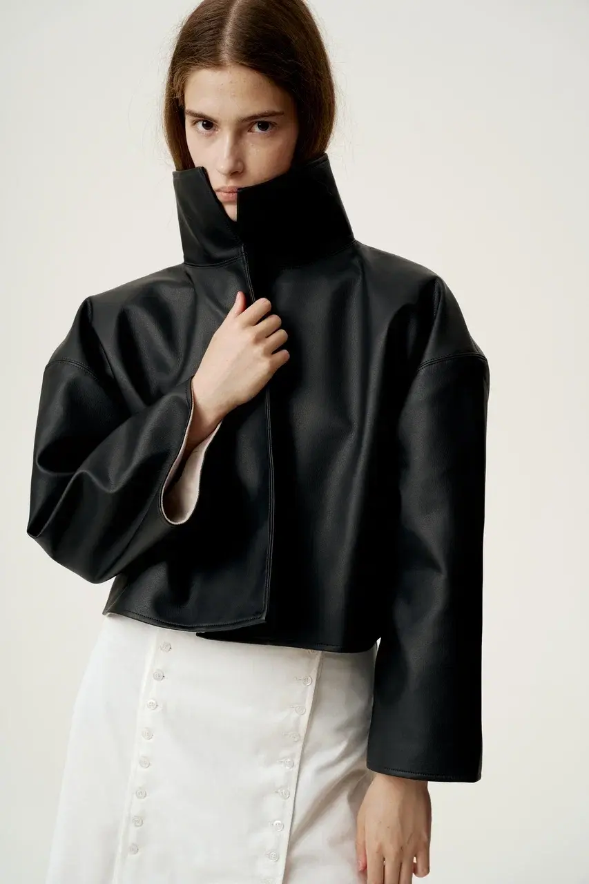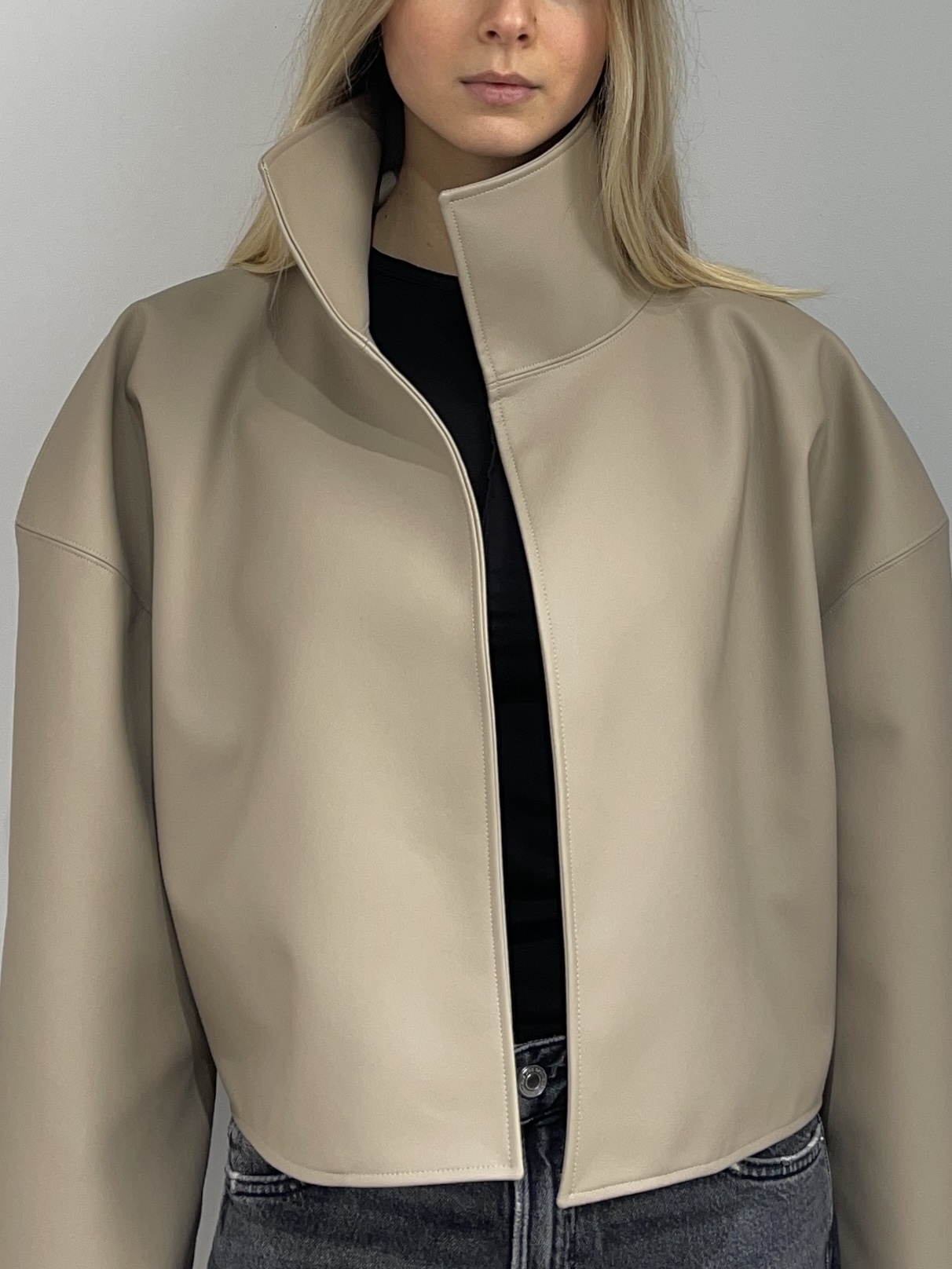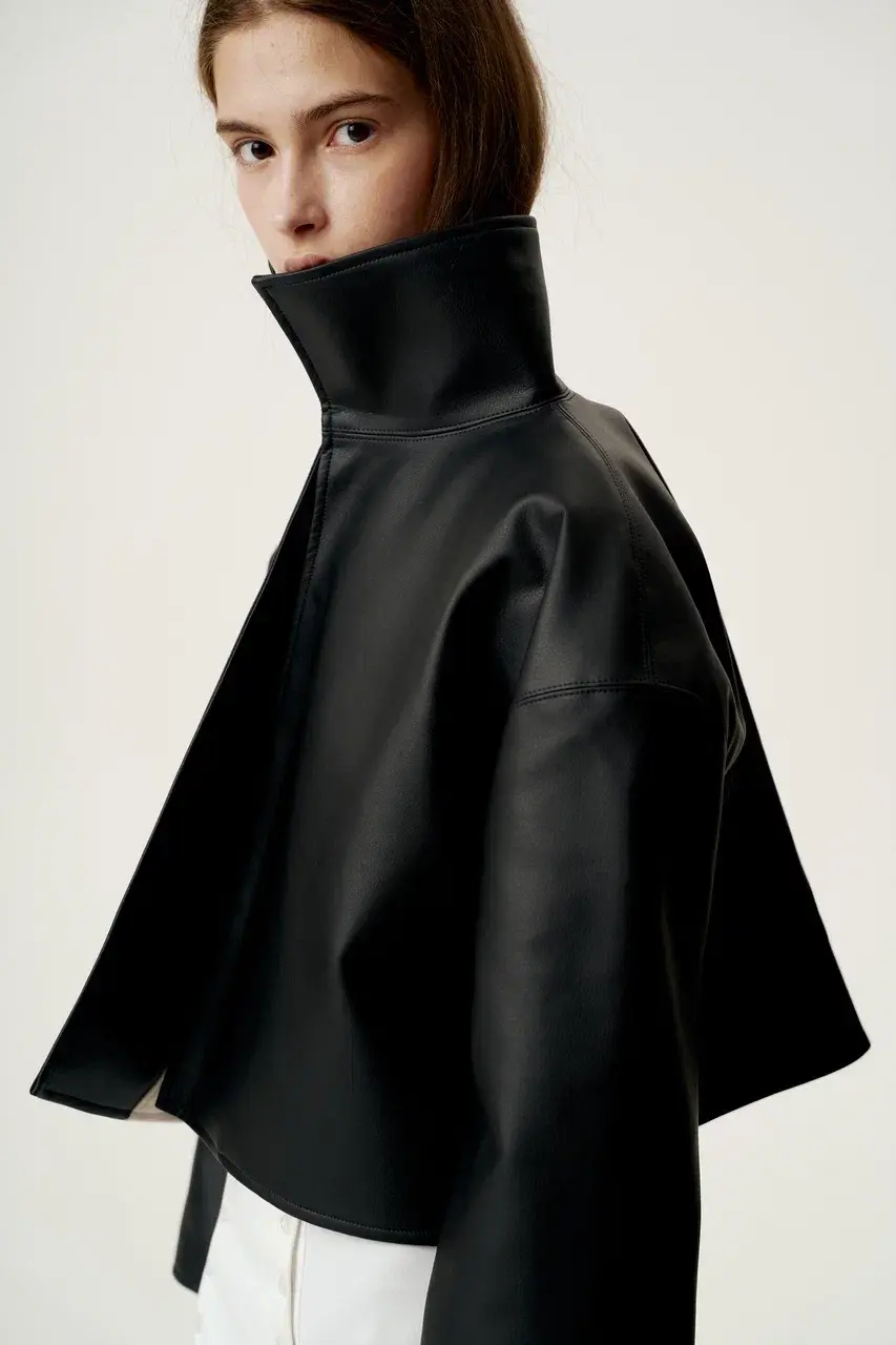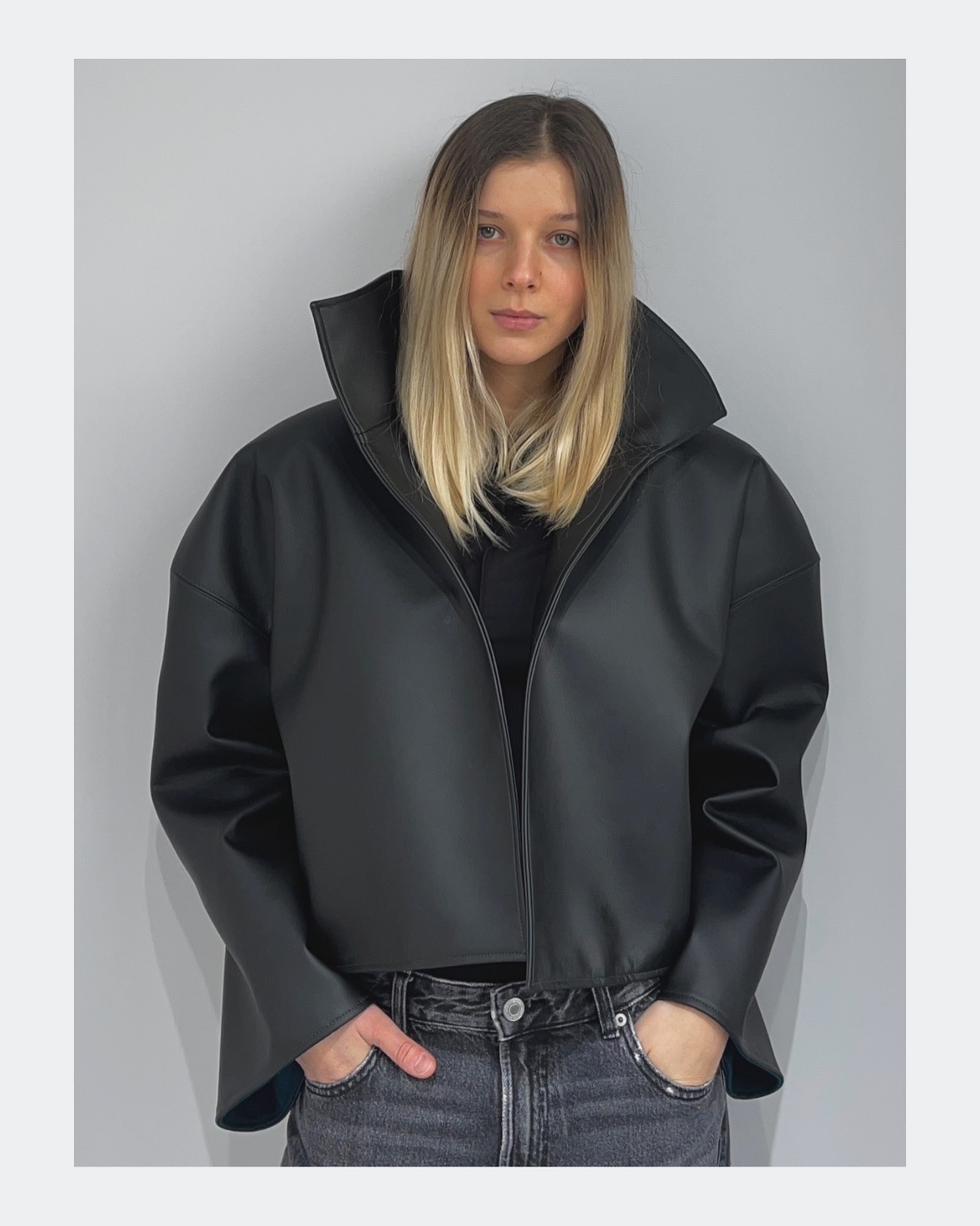 Куртка-накидка выполнена из износостойкой экокожи. Укороченная форма с необычным кроем плеча добавит необычности вашему образу, а высокий ворот служит не только акцентной деталью бомбера, но и защищает от погодных условий, тк экокожа- непродуваемый материал.
