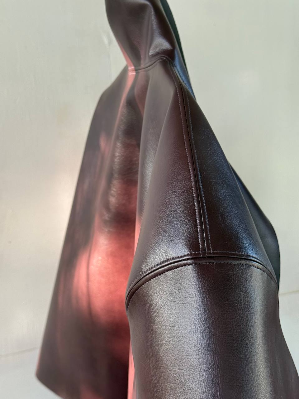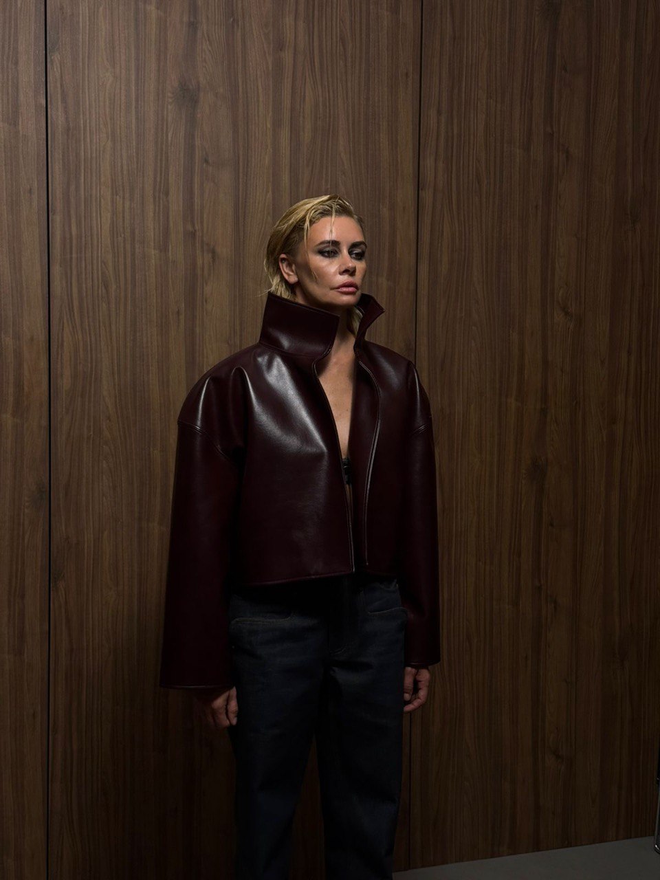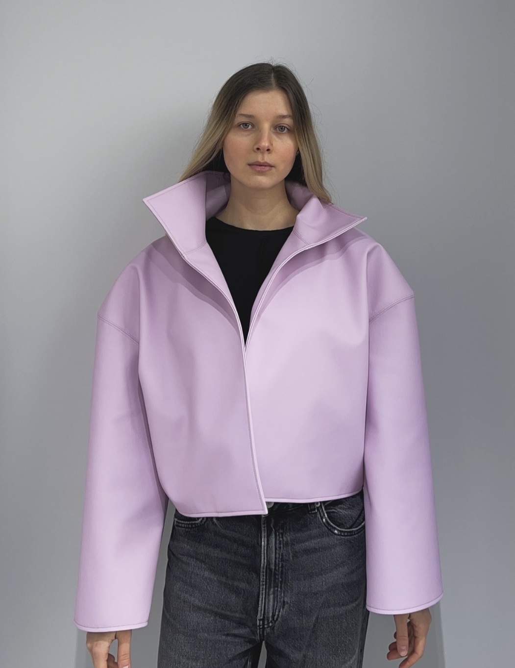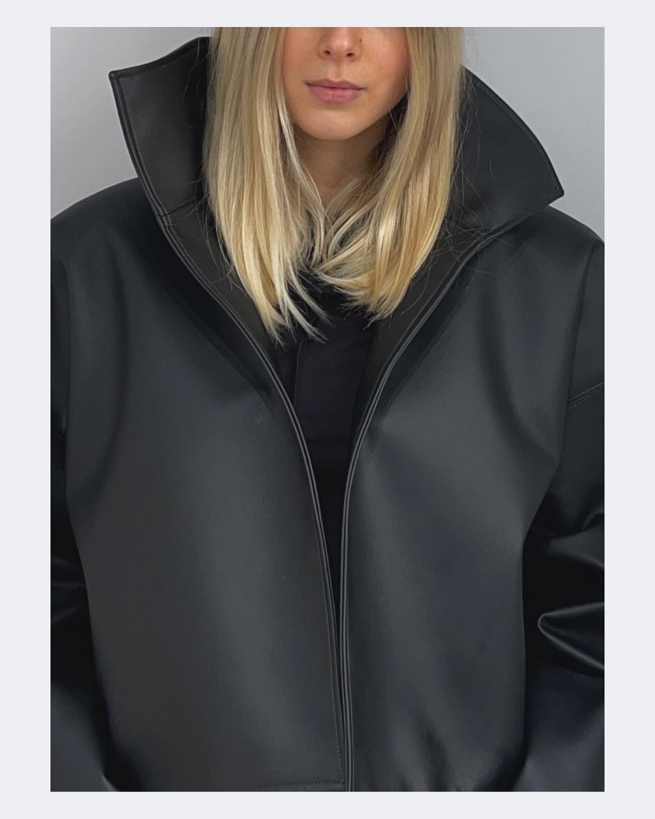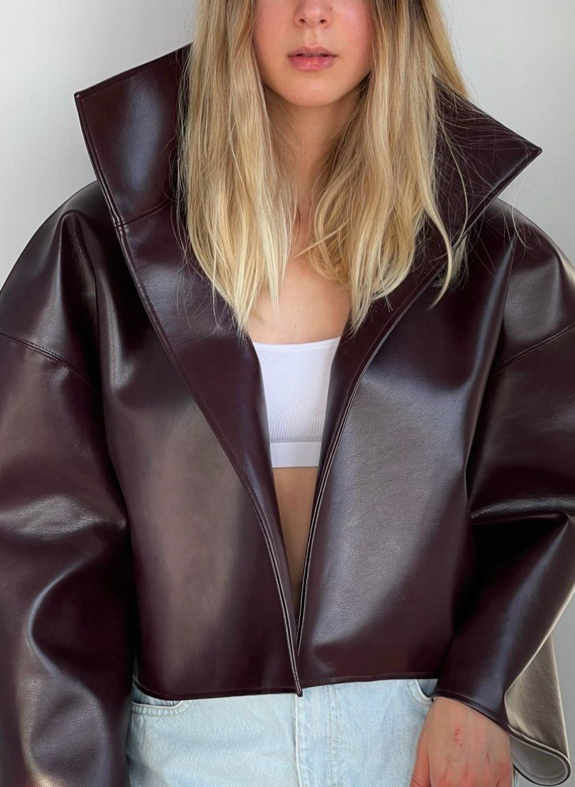 Куртка-накидка выполнена из износостойкой экокожи. Укороченная форма с необычным кроем плеча добавит необычности вашему образу, а высокий ворот служит не только акцентной деталью бомбера, но и защищает от погодных условий, тк экокожа- непродуваемый материал.