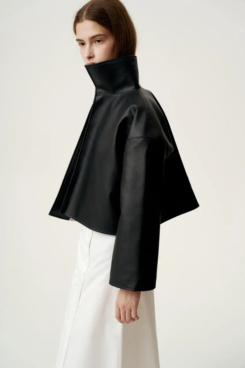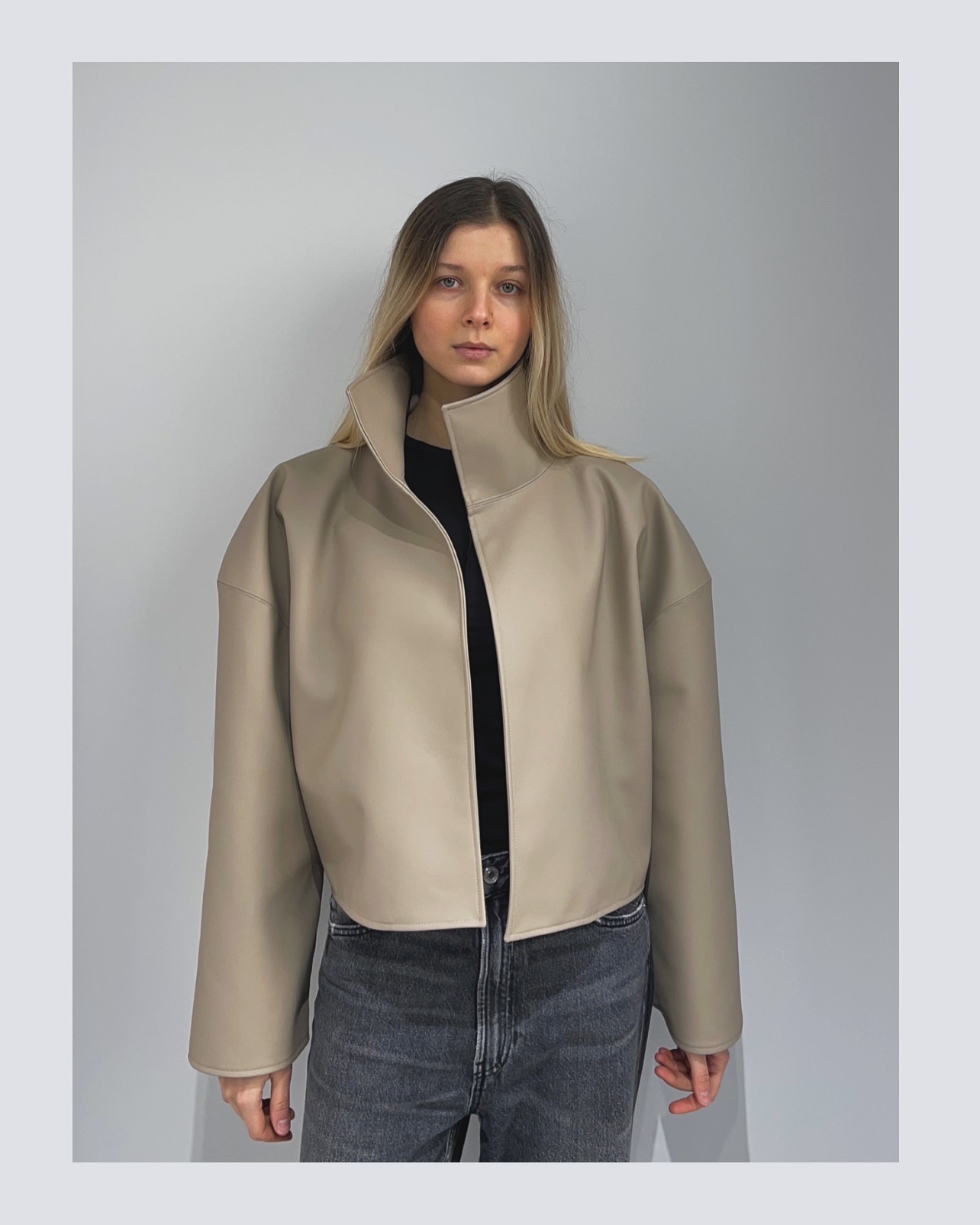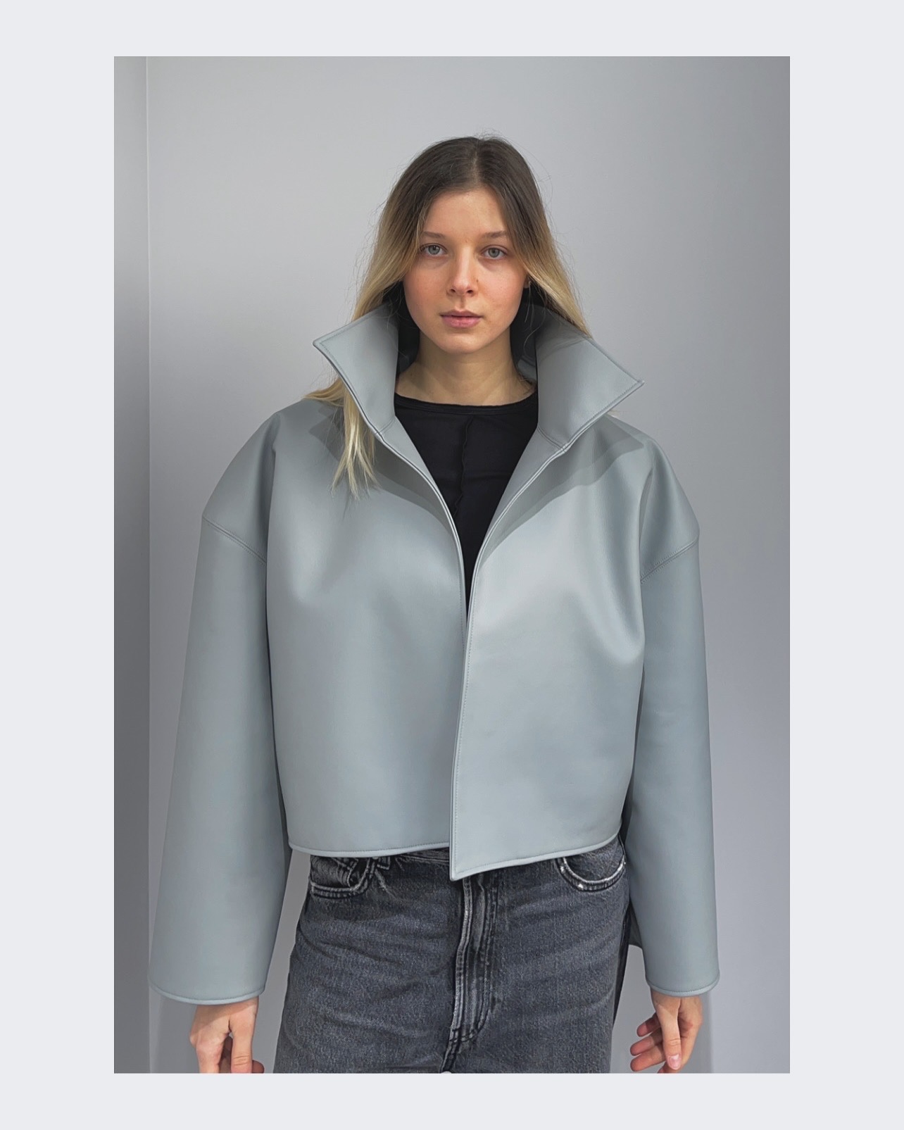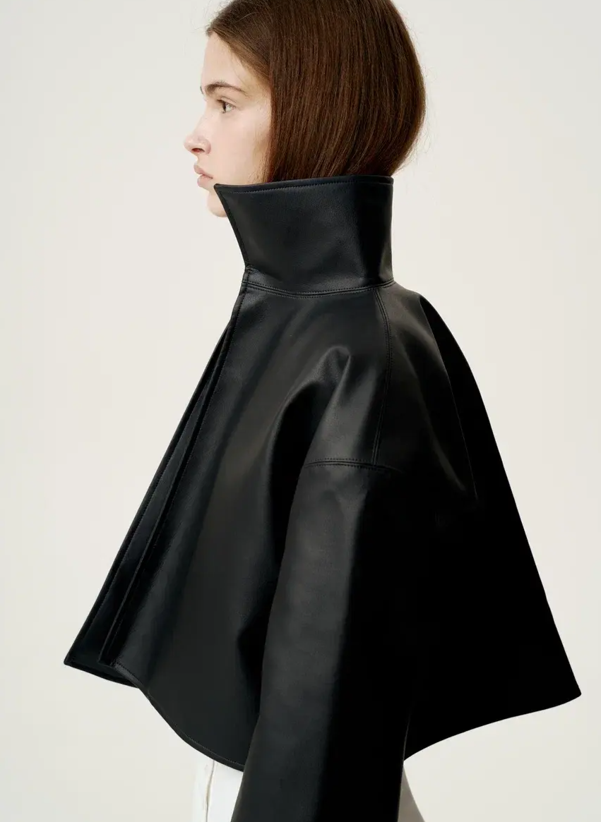 Куртка-накидка выполнена из износостойкой экокожи. Укороченная форма с необычным кроем плеча добавит необычности вашему образу, а высокий ворот служит не только акцентной деталью бомбера, но и защищает от погодных условий, тк экокожа- непродуваемый материал.