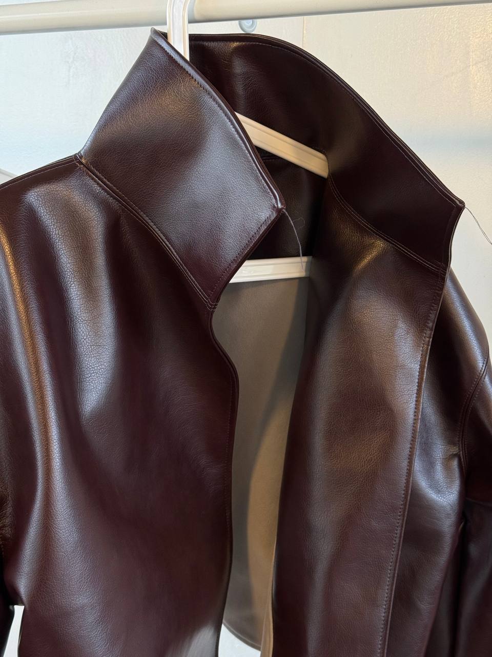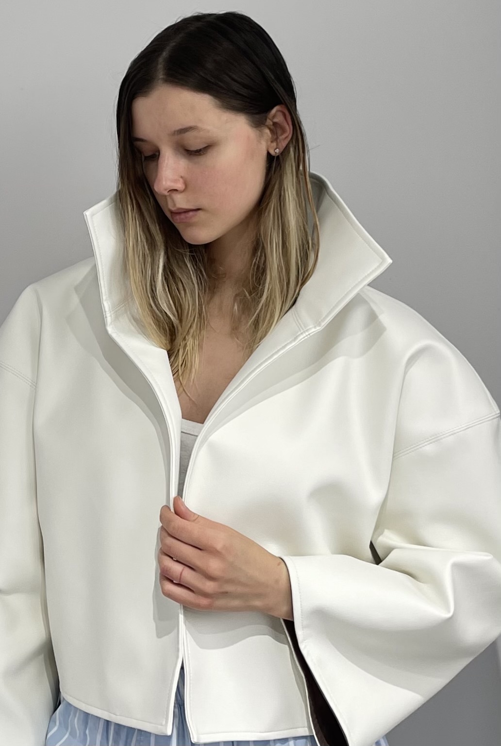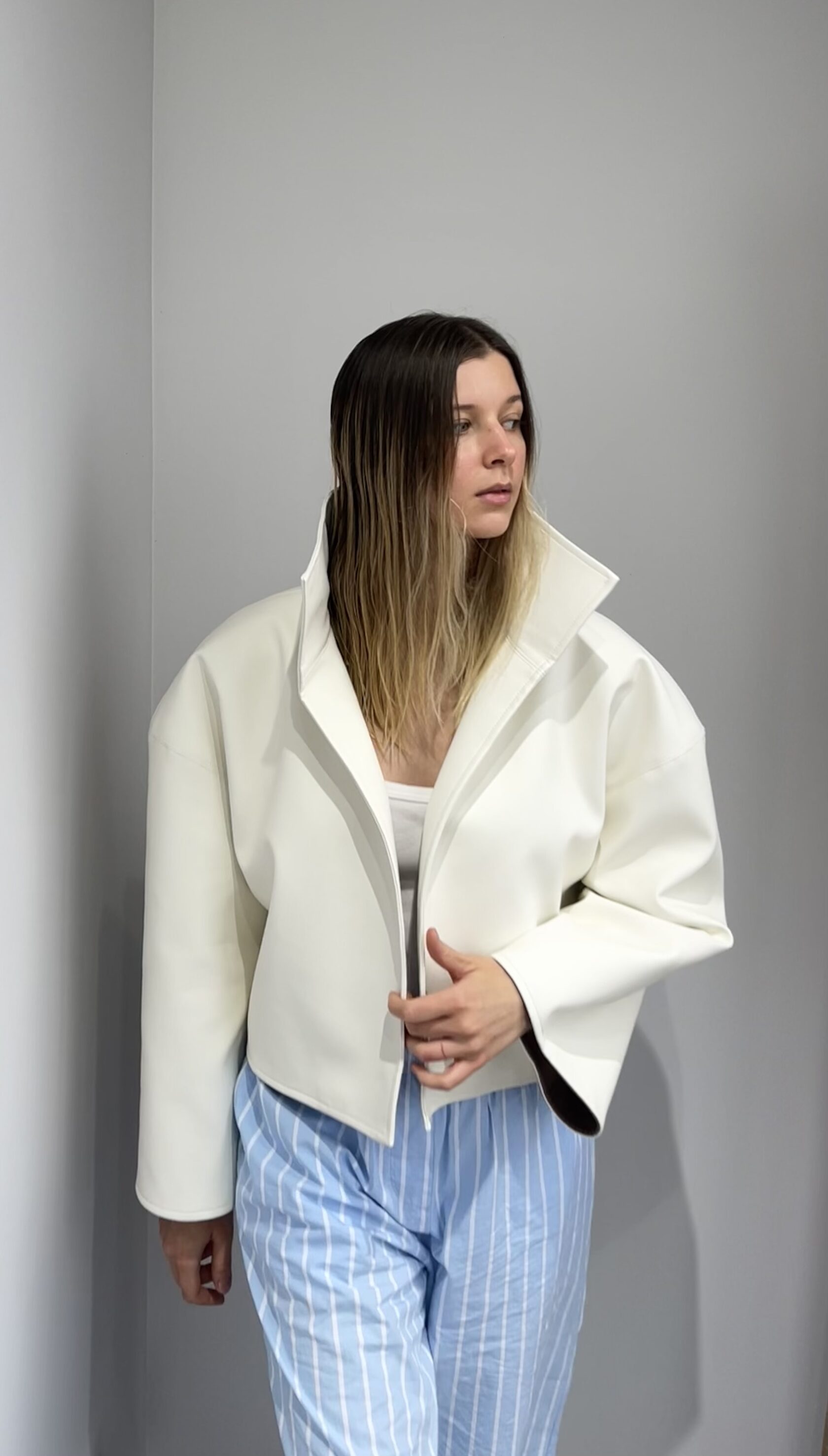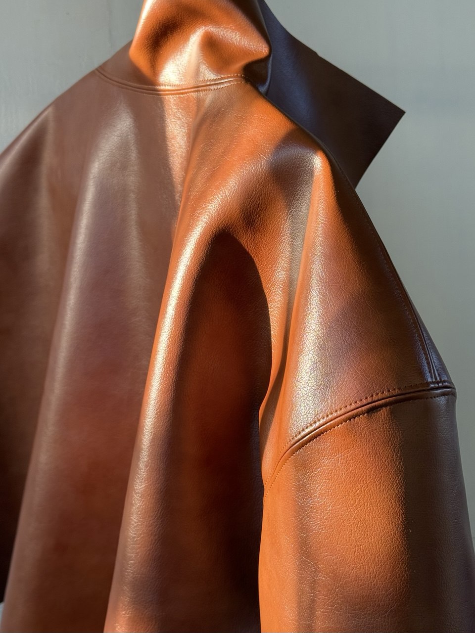 Куртка-накидка выполнена из износостойкой экокожи. Укороченная форма с необычным кроем плеча добавит необычности вашему образу, а высокий ворот служит не только акцентной деталью бомбера, но и защищает от погодных условий, тк экокожа- непродуваемый материал.