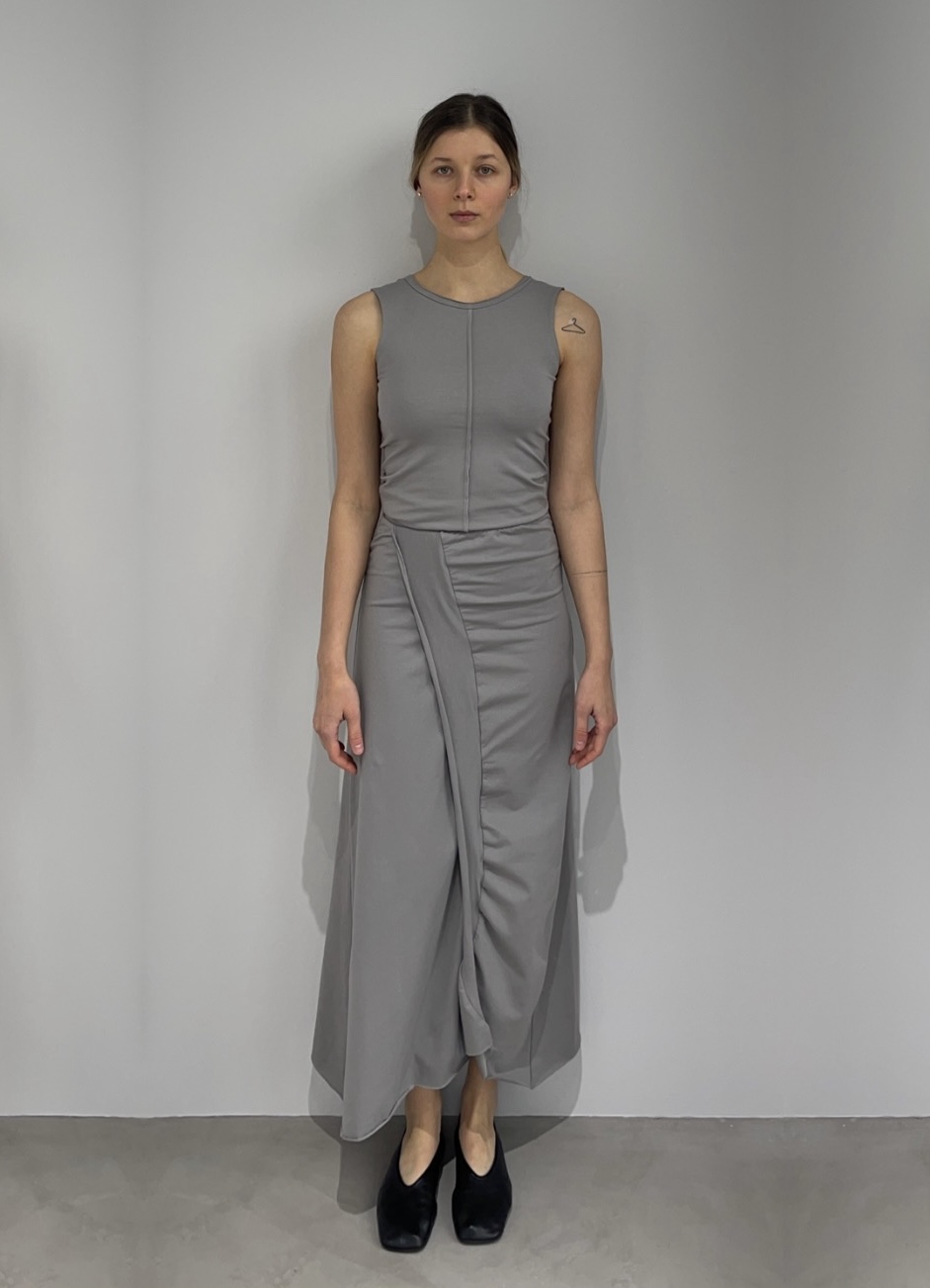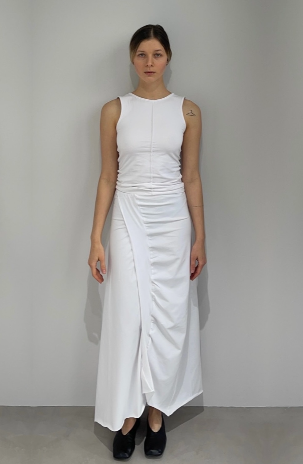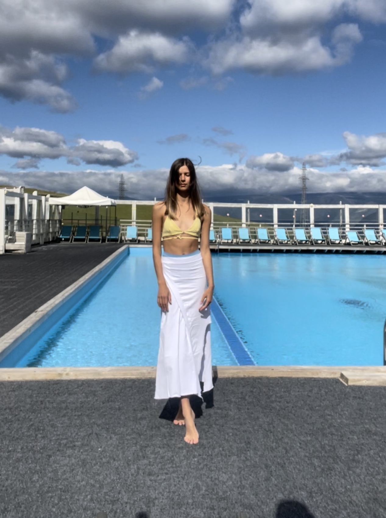 Юбка со сборкой выполнена из эластичной ткани под названием "Кулир", в составе которой 95% дышащего хлопка, 5% нейлона, чтобы изделие легче возвращало свою форму.